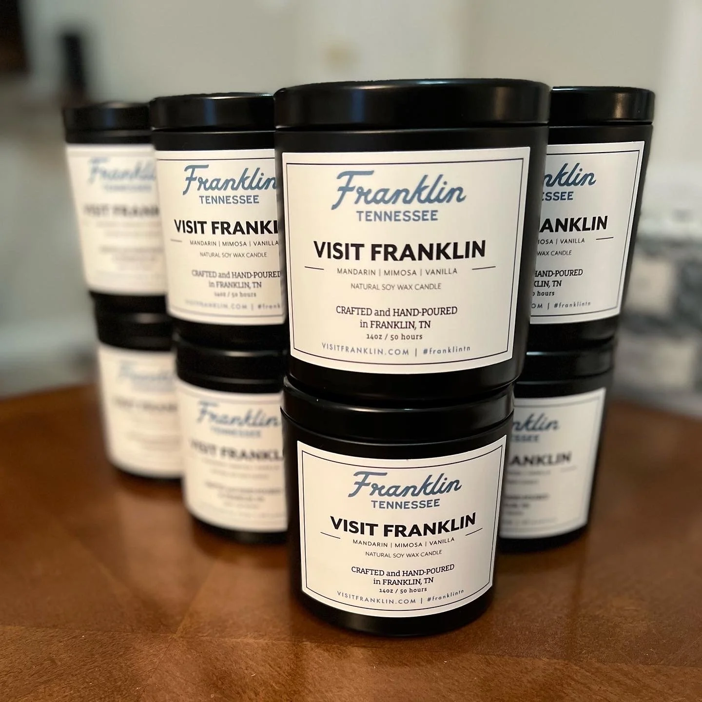 This signature scent was created for the Franklin Visitors Center located in beautiful downtown Franklin at 4th and Main Street. Notes of bright, energetic mandarin and sparkling mimosa rest on a smooth base of vanilla and amber creating a beautiful year round scent. Perfect for your home and work spaces and for gifts. Available in a modern, sleek 14 ounce black tin as well as an 8 ounce black tin.